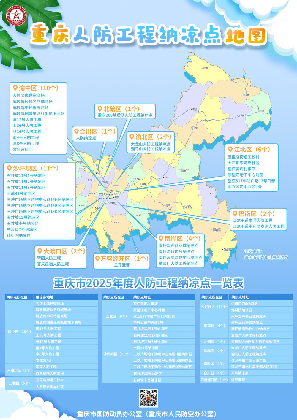 6月26日,记者从市国防发动办得悉,依据重庆市气象台估计,26日白日开端,重庆大部分地区气候逐渐转好,气温逐渐上升,到6月28日中心城区最高温重回35℃。为满意广阔市民消暑纳凉需求,我市10个区的40处人防工程纳凉点将于6月28日悉数向大众免费敞开。