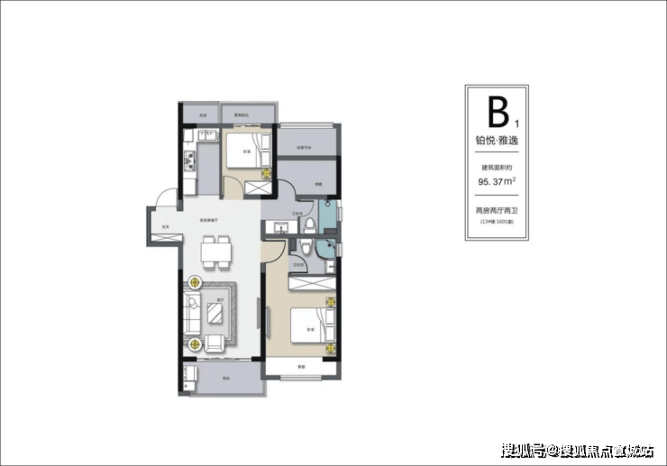 边户B1户型面积95.37㎡,户型方正,南北通透,双开间朝南.进门为玄关设计,增强公共空间的私密性.阔绰南向客厅,局部面宽约3.6米,采光十分通透.此户型最大亮点为南北双阳台的设计,北面增加了一个功能性阳台,可用于放置洗衣机等大型物件,提高了生活舒适度的同时也提升了住宅档次感.