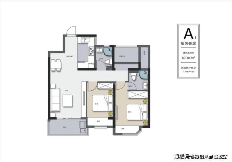 A1户型面积89.84㎡,为经典舒适的3房2厅2卫.本户型最大的亮点为3开间朝南,9.5米采光面,进门左边是厨房,右边是餐厅,能够尽可能的防止厨房的油烟进入到客厅影响居住效果,3.6米面宽的南向客厅敞亮大气,朝南阳台为花桥唯一具有180°无死角观景效果的阳台.